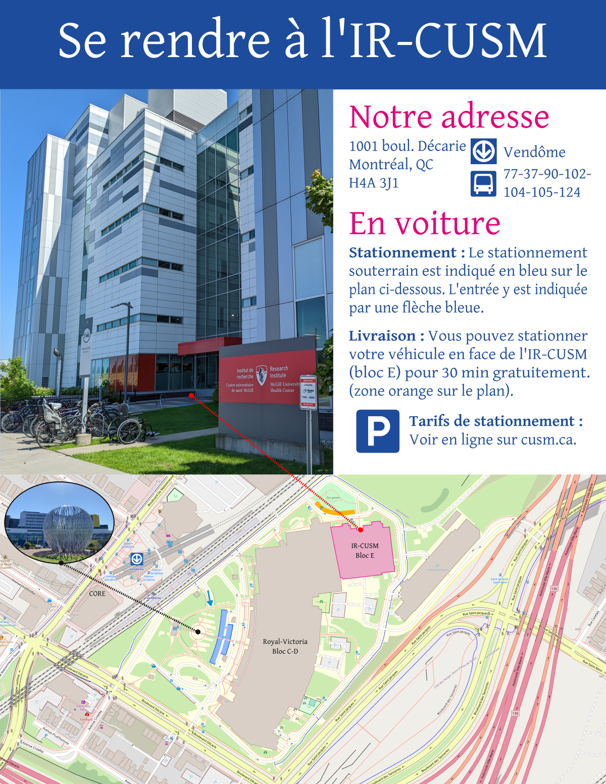 Joignez-vous à nous à l'Institut de recherche du CUSM (Bloc E) qui abrite le Programme IDIGH. Les présentations se dérouleront dans le large amphithéâtre pour faciliter les discussions (E.S1.1129). La séance de réseautage et le cocktail auront lieu dans l'Atrium adjacent qui offre un espace ouvert et lumineux, idéal pour les échanges, les rafraîchissements et les discussions collaboratives.